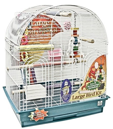 Complete 24-inch by 18-inch by 28-1/2-inch Bird Cage Accessory and Play Kit for large birds. Great for Small Parrots and Conures. Includes a convertable arch playpen top cage constructed of high luster, powder coated, white wire with a teal color base featuring a deep pan, removable tray and a removable grate. Accessories included are: 2 seed and water cups, 2 comfort perches, play rings & links, wood ladder, swing, cement perch, calcium block, rope toy withbeads, treat cup, and 4 sanded perch c