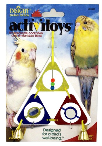 The Triangle Dangle Activitoy uses three eye catching triangles in three bright colors to stimulate and entertain your bird. This toy has a lot going on with two mirrors, two bells and moveable beads. Great for parakeets and cockatiels and other similar sized birds.