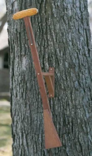 This cedar stick mounts to a tree or post in your yard, which you can attach an ear of corn on with a spring and wire. When the squirrel tries to get the ear of corn, he will spin in a circle. Eventually the squirrel will figure out how to get the corn and eat.