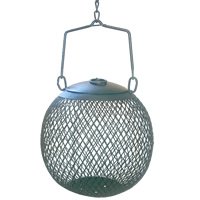 The seed ball wild bird feeder features a usual high quality metal construction and patented mesh feeding system. This feeder is round in shape with green finish and holds 7 cups of black oil sunflower seeds. It measures 6-inch diameter.