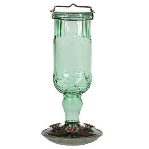 The Perky-Pet Green Antique Bottle Hummingbird Feeder will bring a classic touch to your yard and provide your tiny feathered friends with a tasty treat. This large capacity feeder holds 24 ounces of nectar to ensure that there will be plenty of nectar to go around. The metal base has for flower feeding ports with brushed silver accents. Cleaning is simple with the removable base and hanging is a breeze with the attached metal hanger. Remember to clean your feeder once every two weeks with a mil