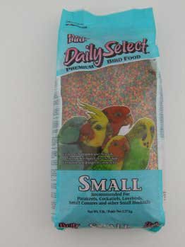Pretty Bird Daily Select Small Bird Food If you're looking for a great quality bird food for small sized birds, then the Pretty Bird Daily Select Small Bird Food may just be perfect for you. It is specifically created for budgies, lovebirds, cockatiels, small conures and other similarly sized hook bills. This original bird food is multicolored, multi-shaped an works as an extruded bird food containing 14-percent protein and 5-percent fat. Product Features: Extruded bird food containing 14-percen