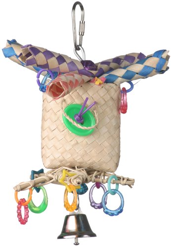 A cute straw bag stuffed with colorful crinkle shred and topped with paper fingers. Plastic buttons, beads, and rings adorn this great destructible toy for small birds. Don't forget to hide a few bird treats in the bag too.