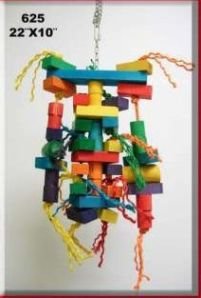 This toy will kept your bird busy for hours. Multilayers. Made of pine wood. Nontoxic dye. Stainless steel chain and ring. Sisal rope allows the wooden pieces to slide. Total size 22 Ht x 10in W approx. Individual pieces range from 1.25 x 3in to 10 x 2in approx. Recommended for medium to large parrots.