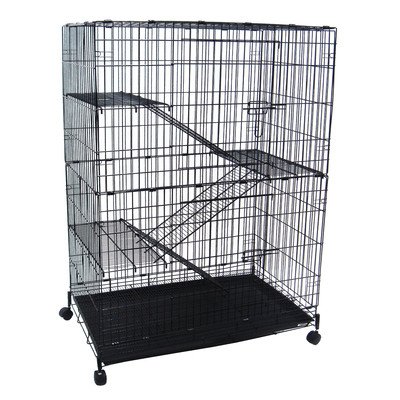 CT52 Features: -Cage.-2 Large front doors.-3 Platforms and ladders (0.5'' bar spacing) to promote exercise.-Walls and doors have 1'' bar spacing.-Floor grate 0.38'' bar spacing.-Easy clean slide out bottom plastic tray.-4 Casters.-No tools needed to setup. Color/Finish: -Powered coated finish. Dimensions: -Overall dimensions: 52'' H x 35'' W x 23'' D.