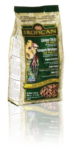 Tropican Lifetime Maintenance Food Sticks for Parrots is suitable for Parrots, Macaws and similar sized birds. The natural extruded bird food provides a balanced dietary nutrition your bird will love. Tropican Lifetime Maintenance Granules for Parrots contains a blend of delicious grains, oilseeds, fruits and vegetables. Specifics include orange oil, banana oil (for flavor), corn wheat, rice, sunflower kernel, flaxseed, oat groats, tomato, soybean, peanut kernel, spirulina, rosemary extract, vit