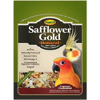 Higgins Safflower Gold Natural Food Mix for Conures & CockatielsOur Higgins Safflower Gold Natural Food Mix for Conures & Cockatiels is a premium safflower-based, fortified seed diet. Safflower Gold is a wonderful way to ensure that your pet bird receives a nutritious diet without sunflower seeds. This bird food is specially formulated with vitamins, minerals and amino acids along with premium ingredients that are free of artificial colors and preservatives. Unlike other safflower-based diets, S