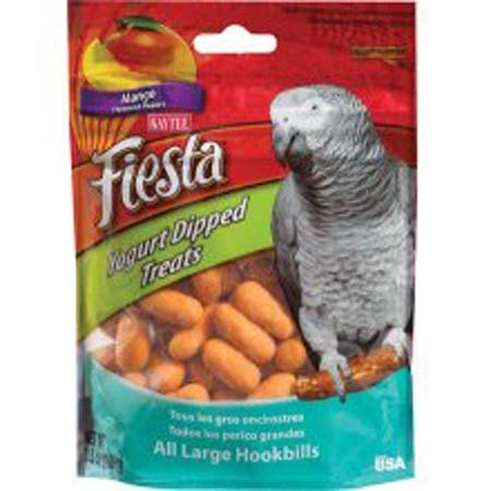 Kaytee Fiesta yogurt dipped treat in mango flavor for parrot. Yogurt dipped treat is crunchy fortified nuggets with a smooth, delicious and fruit flavored yogurt coating. This treat is healthy and fun treat for pet. Designed for large size birds. Available in 3.5-ounce. Feeding instructions, treats add variety and can be fed up to 20 percent of the total food intake. Discard unused portion if soiled. The majority of your pet's diet should consist of one of Kaytee's nutritionally fortified diets,