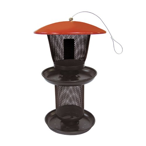This multi seed feeder incorporates metal construction which helps protect birds from avian diseases. The patented feeding system with baffle dispenses seed evenly through mesh sides and in two trays. This all metal rigid feeder is brick red and black to make this a standout. Stands 14-inch high with 4 pound seed capacity.