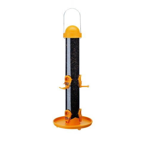 These finch bird feeders are so bright and stylish, yet consumer-minded too. The Perky-Pet Finch Feeder features 6 feeding ports, a 1.5-pound seed capacity, a quick release tray (which saves seed and simplifies cleaning) and unique twist n’ lock removable perches that attract both clinging and perching birds. The clear plastic reservoir makes it easy to monitor seed levels. Hang mount. This feeder is one of the most economical and convenient finch bird feeders on the market. Stylish in its fla