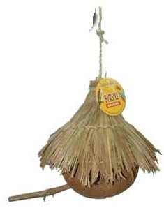 Coconut unlike any thing you have seen. The shell is clean with various openings for your bird. The roof is made of sticks and sisal rope. Roof is made of straw-like reeds. This toy offers a natural environment for your bird. Can also be used for small animals also. Birds can shred the inside in order to make a nest.