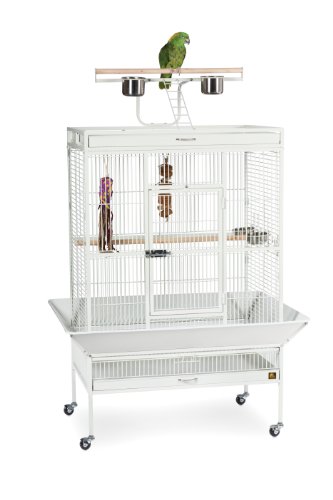 Prevue Pet Products wrought iron select cage in chalk white offers quality craftsmanship at an affordable cost. Constructed of wrought iron with a cagetop playstand to keep your bird entertained and content, the heavy-duty push button lock keeps your bird securely inside its cage when playtime is over. This select bird cage also includes four stainless steel cups, two wood perches and a castered stand for portability. Both drawers and bottom grille are removable for ease of cleaning while the ro