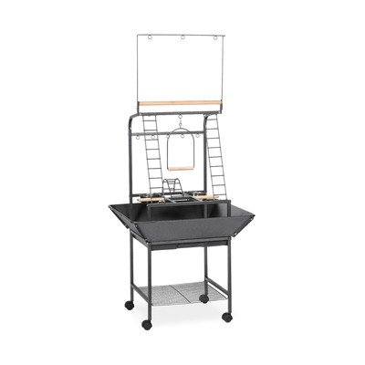 The Small Parrot Playpen Stand will give your parrot plenty to do with its fun design. It includes eight hooks for hanging multiple toys and treats, along with three ladders for plenty of opportunities to climb. A swing is also included for even more adventure. Double cups provide room for food, water, and treats, and the easy-rolling caster stand means the playstand can be moved from room to room or indoors/outdoors. The pull-out grille and drawer, along with the rounded corner seed guard, make