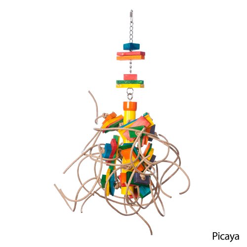 Zoo Max Picaya Bird Toy has so much for your bird that is mentally and physically stimulating that your bird will never be bored. Picaya has multicolor wooden blocks in various shapes and sizes; twisted paper cords to chew on; stainless steel chain; and a large plastic pipe like structure in the middle tying it all together.